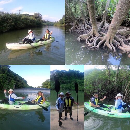 はいさい おきなわ! 涼しい午前中からカヤックでマングローブ探検。 ゲストは、お子さんと3人乗りファミリーさん。 まだまだ暑い沖縄、帽子は必需品です。 沖縄家族旅行の楽しい思い出になりますように! 比謝川マングローブカヤックならウエーブマリンクラ…